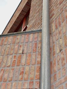 La phase chantier a révélé son lot d’inattendus. Près de 10 % des briques livrées étaient inutilisables, nécessitant une commande complémentaire pour finaliser la façade. Peu habitués à travailler avec des briques aux dimensions irrégulières, et aux panneresses décaties, les maçons ont initialement exprimé incompréhension et dépit. Après les avoir rassurés sur le fait que nos attentes s’accommoderaient des imperfections, le travail a pu reprendre, sans conviction malheureusement. Les joints ont été réalisés au mortier de chaux, une solution réversible, facilitant un éventuel démontage à l’avenir.